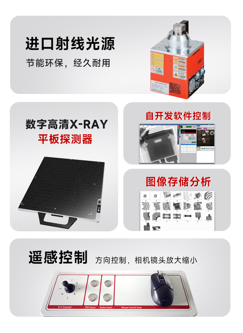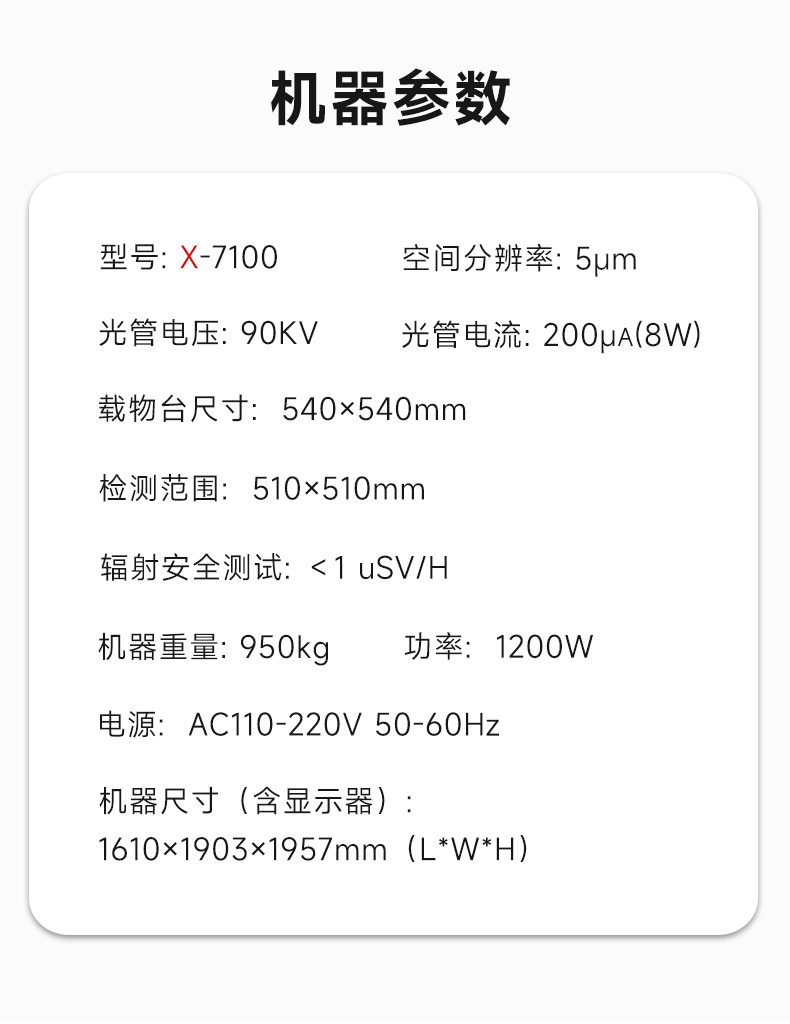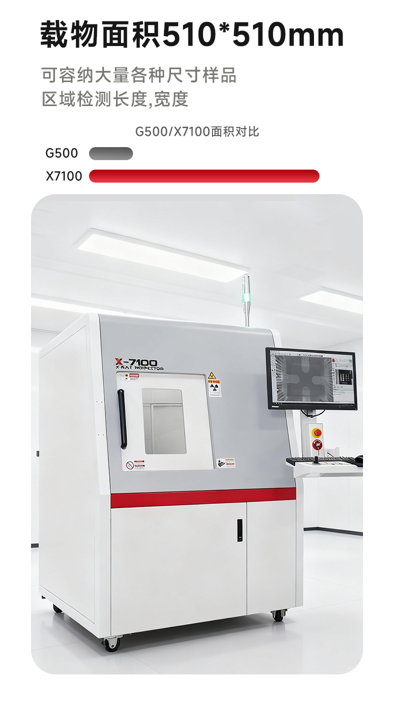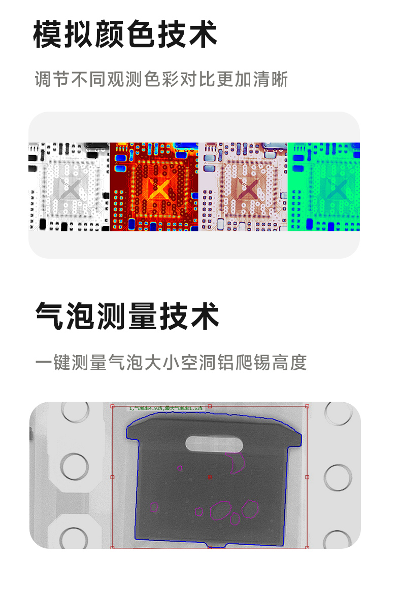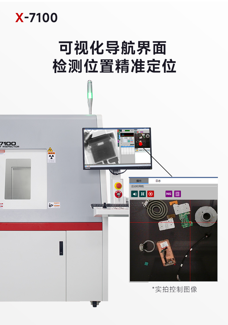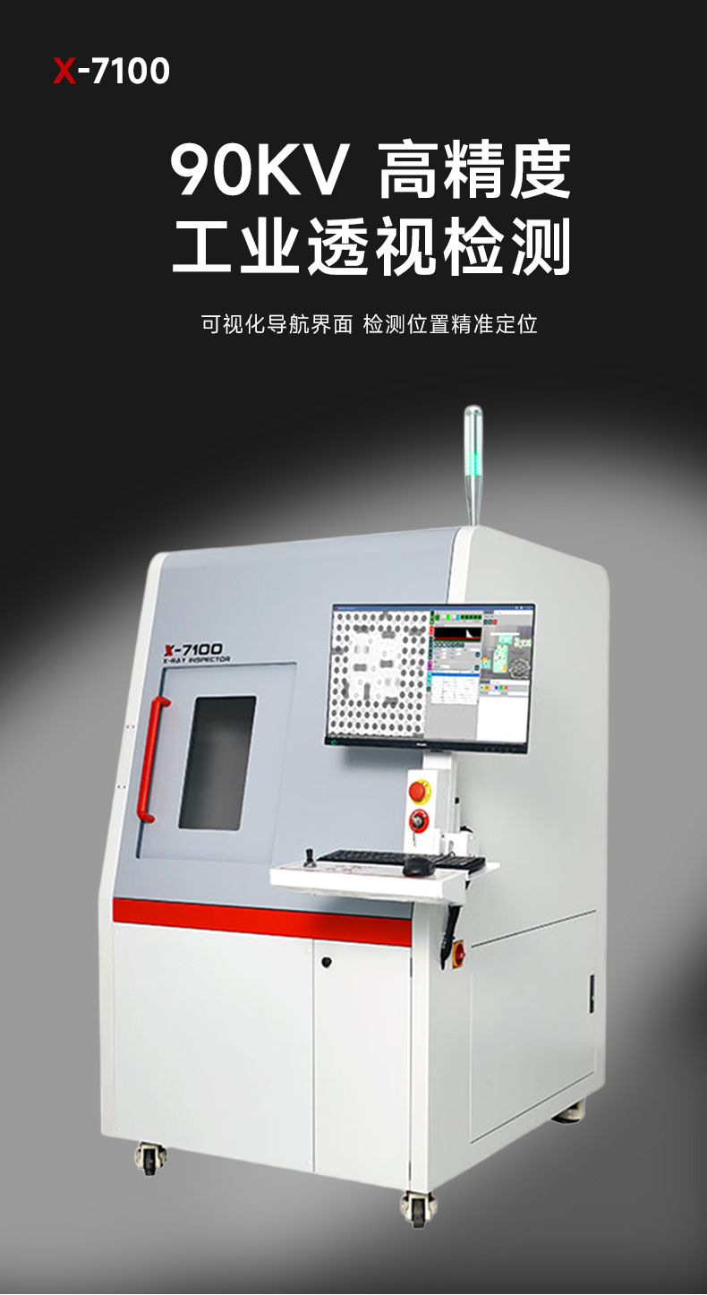 X-7100检测设备,应用领域非常广泛,常见应用于电子元器件的内部结构检测,常见气泡空洞率测量、电路短路断路、焊点缺焊少焊漏焊、内部存在异物裂缝等。具有方便维护,使用寿命长;操作简单,减少操作人员的培训 ;检测的重复精度高 :允许最大60度视角检测样品等特色。